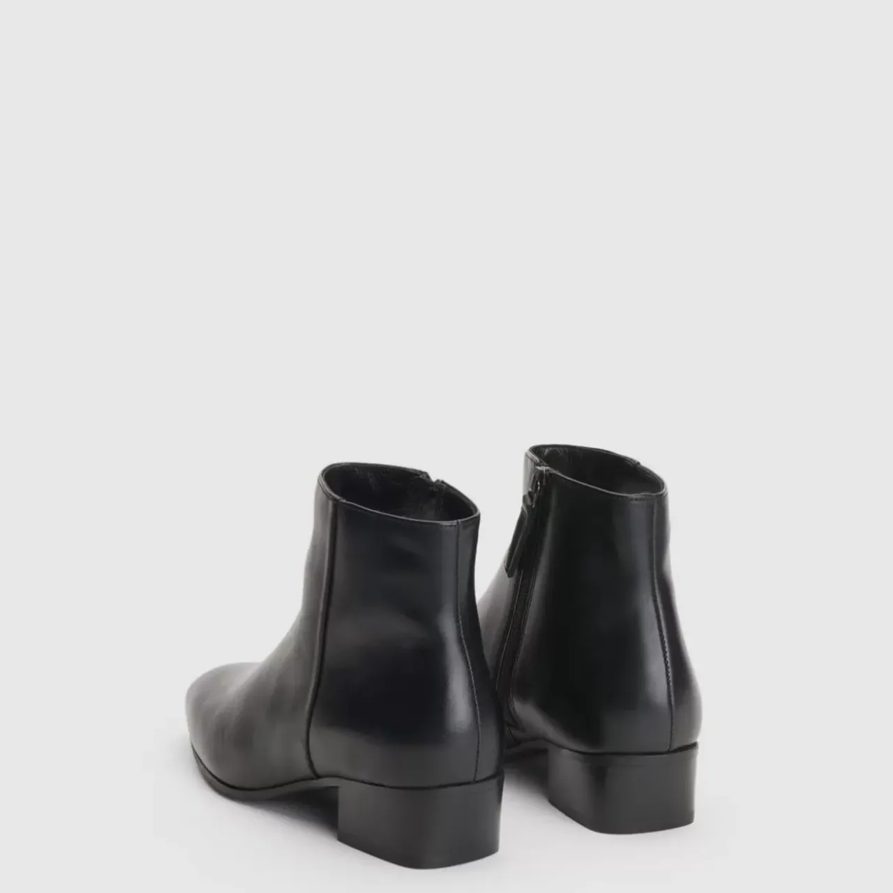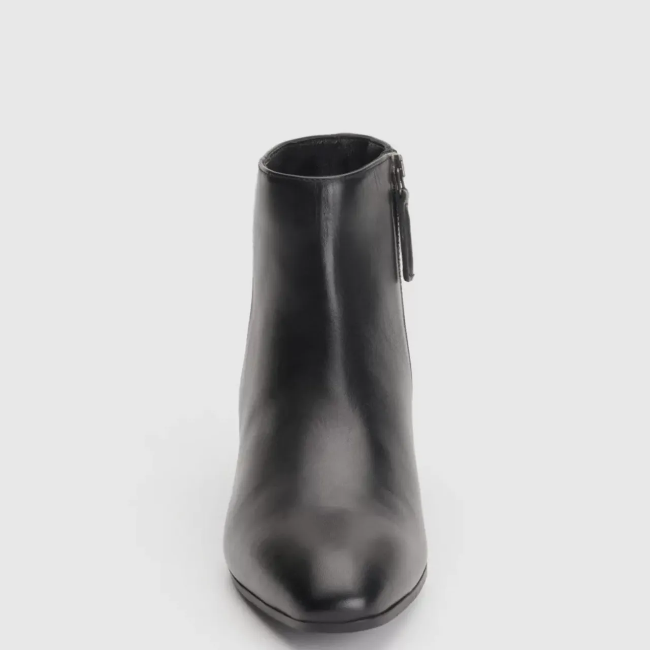 Pointy Toe Leather Bootie With An Inside Zip On A Stacked Heel.