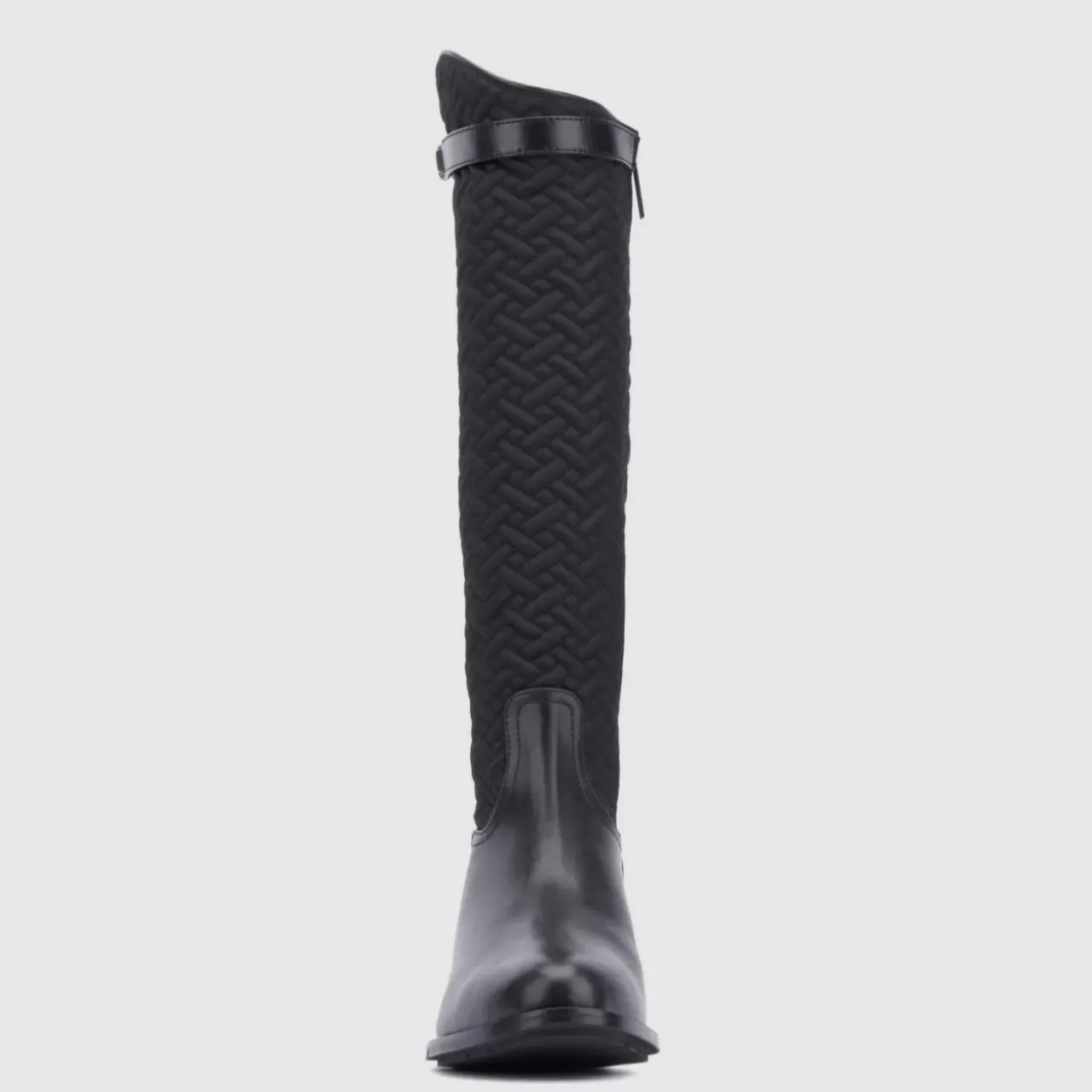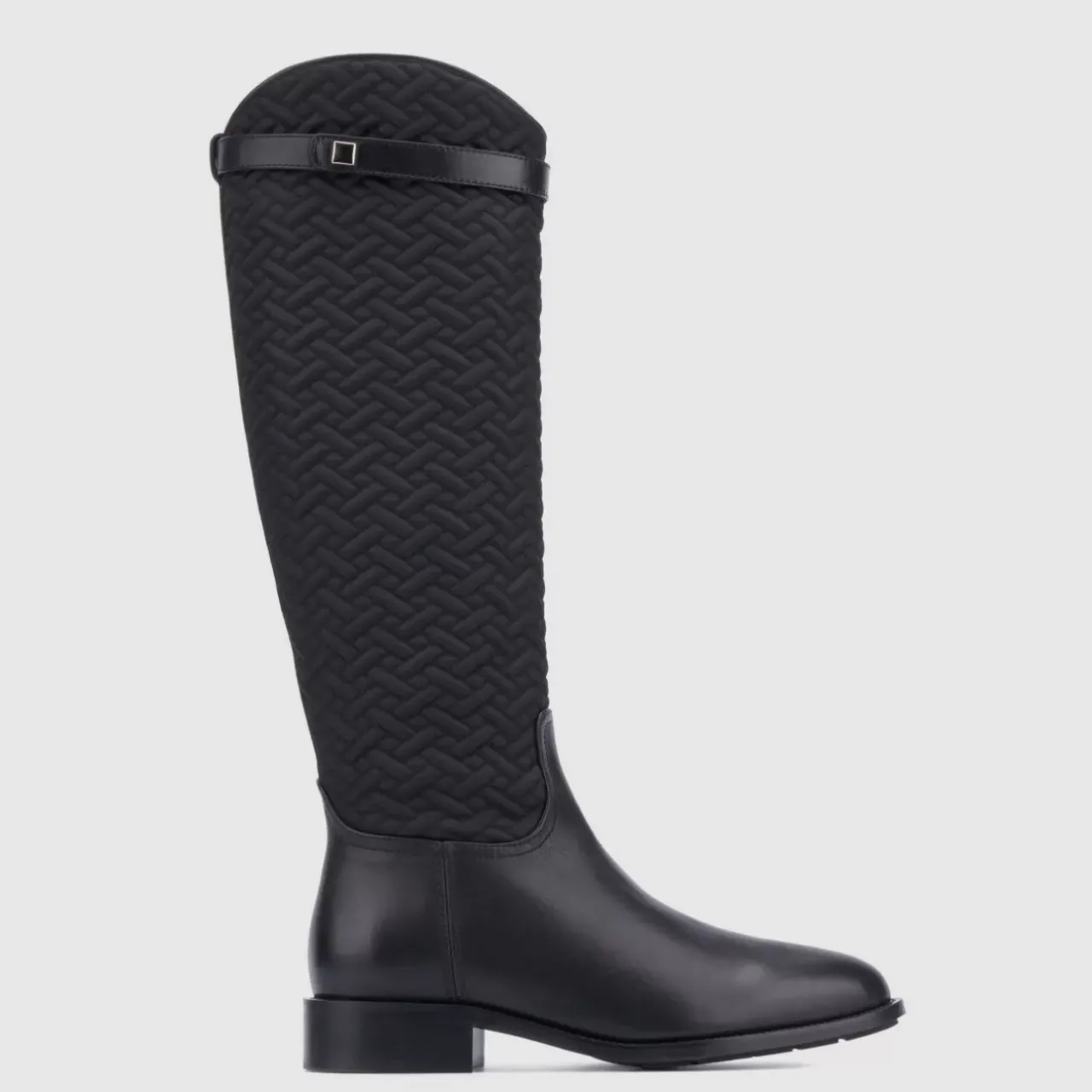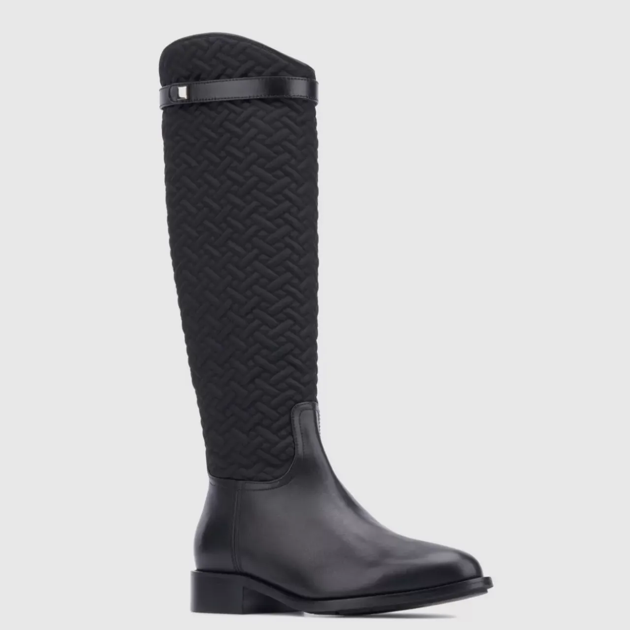 Calf Leather Blends Beautifully With Quilted Nylon On Our Natala Riding Boot, Accented By Decorative Straps And Square Stud Details. With Breathable Lining And An Inside Zipper, A Stacked Heel And Almond-Toe Silhouette Further Enhance The Look.